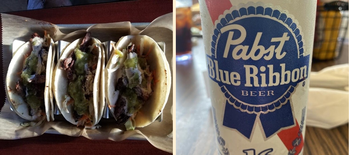 The menu includes a variety of shareables, handhelds, salads, pizzas, tacos, and dinners. Popular items are the Bacon Platter and BBQ Pork Sandwich, with average prices around $10 to $14.